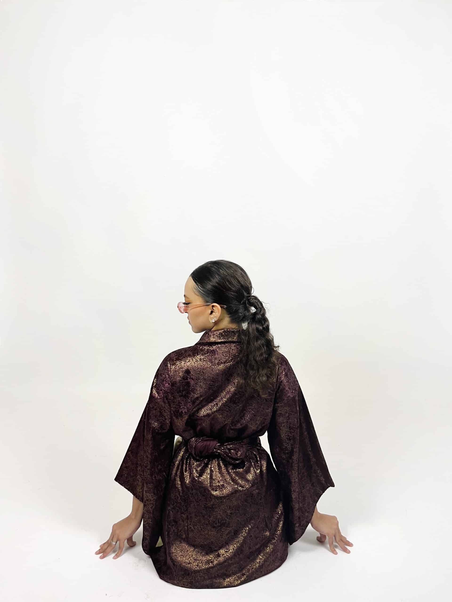Kimono robe en lame doré et brun  contraste lumineux et allure raffinée
